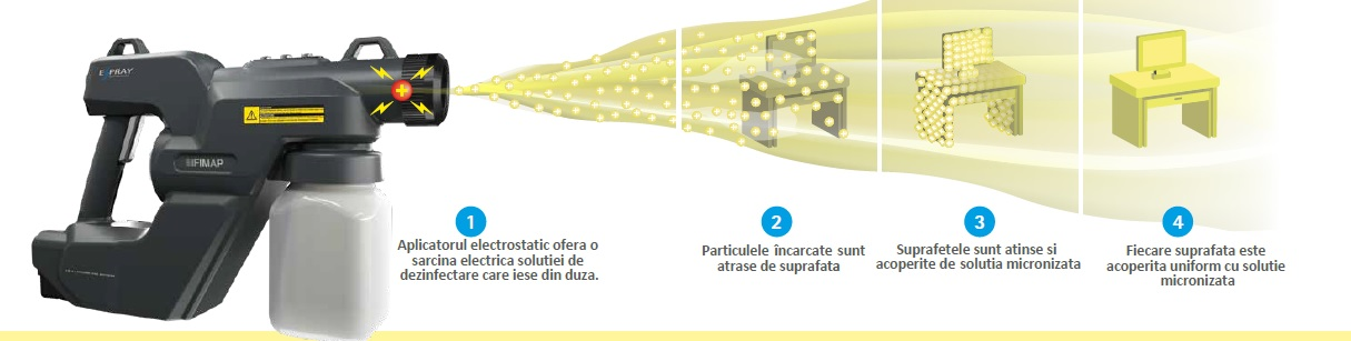 Igienizarea electrostatică permite acoperirea rapidă și uniformă a unei suprafețe cu o soluție igienizantă. Aplicatorul electrostatic asigură o încărcare electrică a soluției care iese din duză. Moleculele încărcate se resping reciproc, astfel încât păstrează o distanță uniformă unele de altele, dar, în același timp, sunt atrase de suprafața de tratat. Rezistența particulelor încărcate este mai mare decât cea a gravitației, astfel încât acestea sunt atrase imediat de suprafață și nu cad la sol.